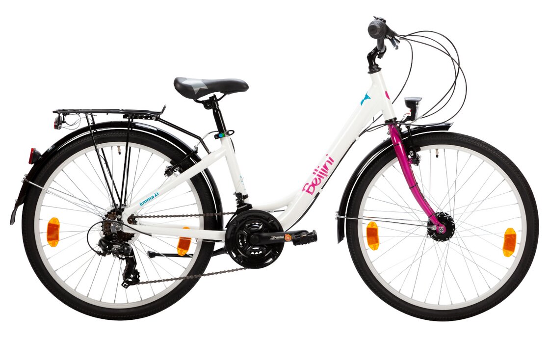 Sportlich oder gemütlich – Mädchen finden bei Bellini das passende Trekkingbike, wenn sie gleichzeitig einen Begleiter für den Alltag und die Tour ins Grüne brauchen. Das Emma 21 fühlt sich nämlich in beiden Welten gleichermaßen wohl. Dafür sorgt zum einen die Ausstattung, aber natürlich auch der wertige Tiefeinsteiger Rahmen aus Aluminium. Zudem rollen die 24″ Laufräder mühelos über jeden Untergrund. Egal ob Schotter, Pflasterstein oder Asphalt, du wirst überall richtig viel Spaß haben.