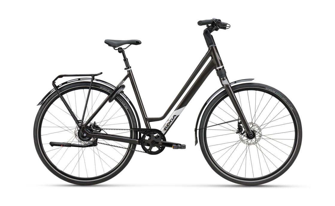 Kogas „F3 6.0“ verkörpert die Substanz eines zeitgerechten Stadtfahrrads. Mit seinem Tiefeinsteiger-Design aus Aluminium vereint es Komfort und Bestädigkeit. Die eingebaute 8-Gang-Nabenschaltung mit Freilauf und Riemenantrieb sorgt für sanfte Gangwechsel, während die hydraulischen Scheibenbremsen präzise Kontrolle bieten. Dank der aufrechten Sitzgeometrie und der Entsprechung mit den StVZO-Normen erweist sich dieses Stadtrad als sicherer Partner für den urbanen Alltag.